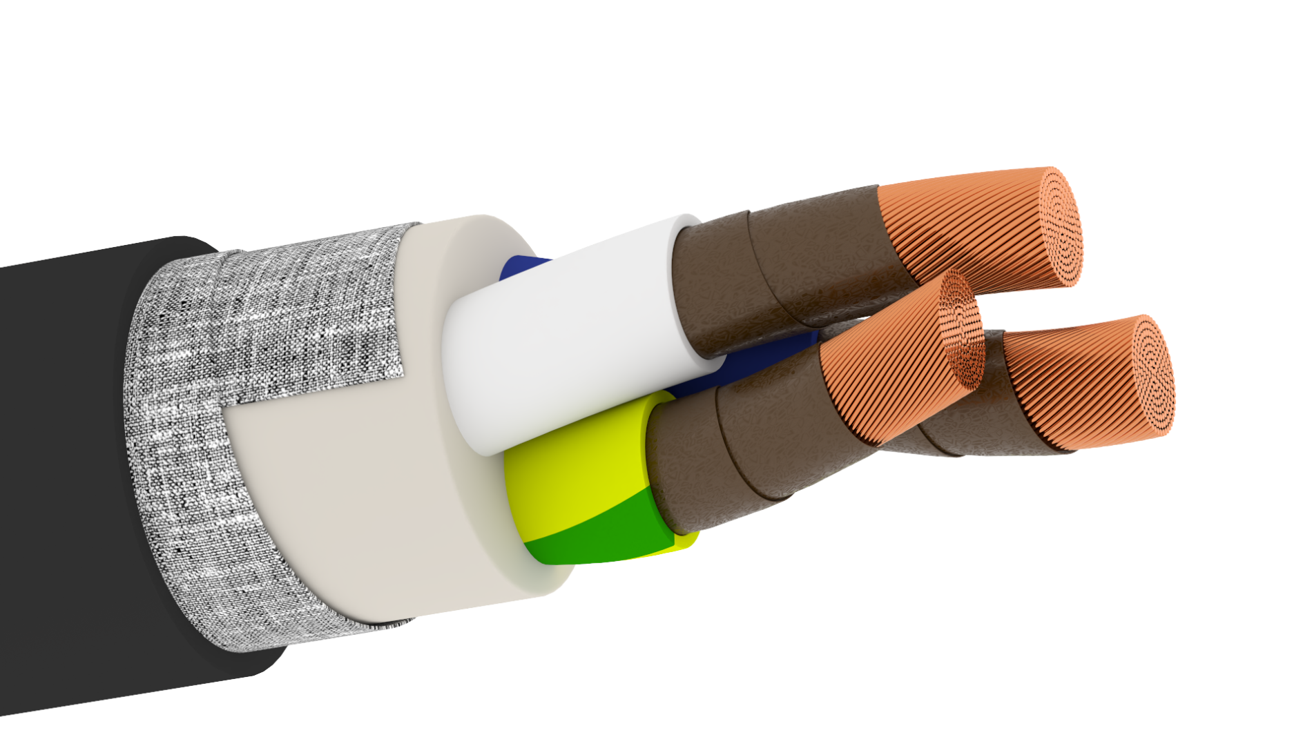 1. Три многопроволочные круглые токопроводящие медные жилы номинальным сечением 50 мм 2 , соответствующие 5 классу по ГОСТ 22483-2021 . 2. Термический барьер в виде обмотки из двух слюдосодержащих лент. 3. Изоляция жилы из полимерной композиции, не содержащей галогенов. 4. Заполнение внутренних и наружных промежутков между скрученными изолированными жилами. 5. Поясная изоляция из полимерной композиции, не содержащей галогенов. 6. Оболочка из полимерной композиции, не содержащей галогенов.