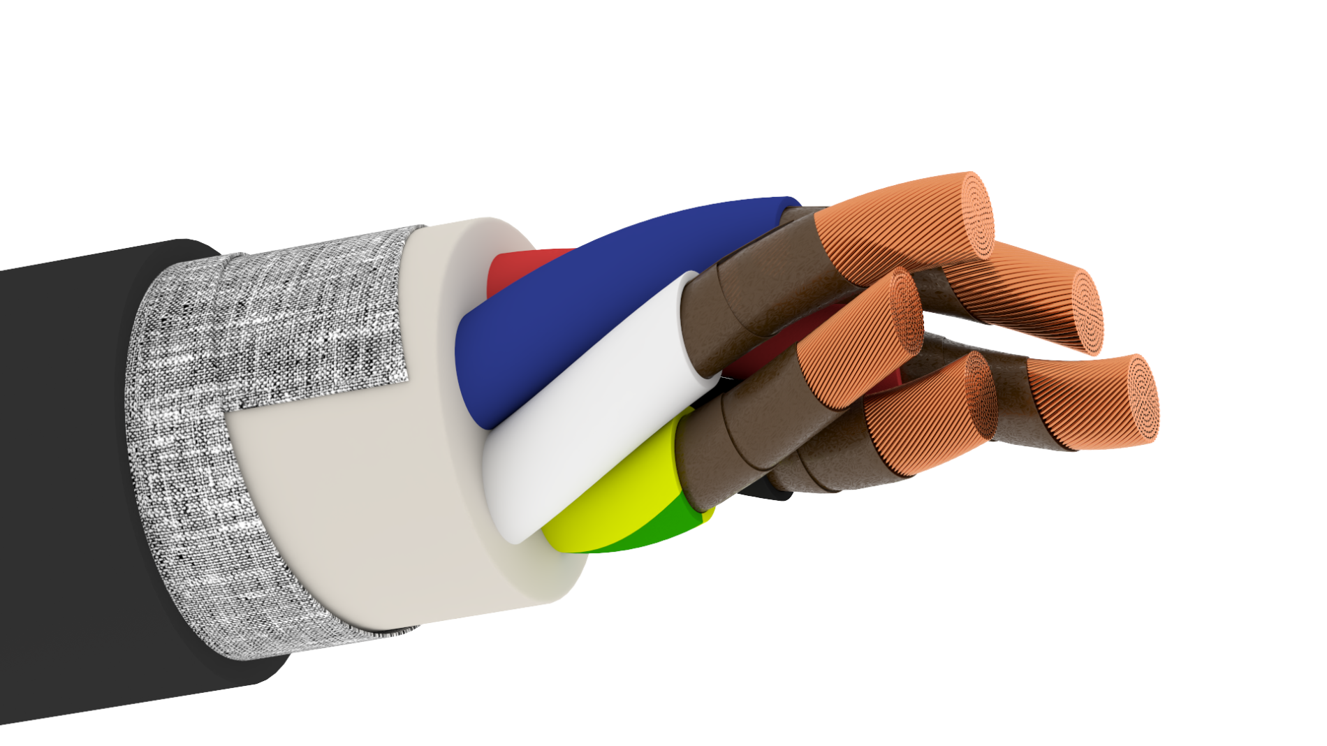 1. Пять многопроволочных секторных токопроводящих медных жил номинальным сечением 185 мм 2 , соответствующих 5 классу по ГОСТ 22483-2021 . 2. Термический барьер в виде обмотки из двух слюдосодержащих лент. 3. Изоляция жилы из полимерной композиции, не содержащей галогенов. 4. Заполнение внутренних и наружных промежутков между скрученными изолированными жилами. 5. Поясная изоляция из полимерной композиции, не содержащей галогенов. 6. Оболочка из полимерной композиции, не содержащей галогенов.